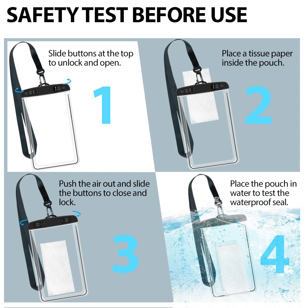 It is important to perform a water test before using the product. Put a tissue paper inside the bag, be sure the bag is securely closed and drop it into the water for 30 minutes. Remove the bag from the water and check if the tissue is wet or not. DO NOT use the product if the tissue is wet. Usage Tips: 1. Inserting Your Smartphone